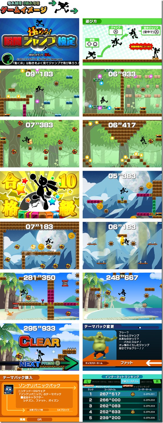 This is actually a sequel a little-known DSi Ware title called Jump Trials but does feature improved graphics and new powerups such as a triple-jump shoes or levitator boots. You’ll be able to play in regular, challenge and course attack modes.