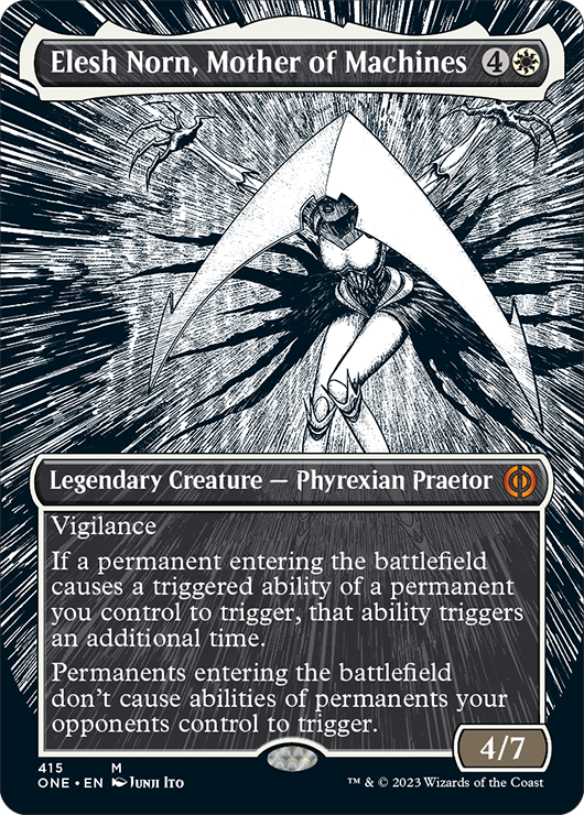 Famed horror manga artist Junji Ito makes a surprise return to Magic: The Gathering with a full art treatment of classic villain Elesh Norn in the upcoming set Phyrexia: All Will Be One. It will be released in February 2023, as revealed in Wizards of the Coast’s WeeklyMTG stream on December 13, 2023. People will see the card in-game in Magic: The Gathering Arena first on February 7, 2023. It will come to the physical game on February 10, 2023. Ito renders the card Elesh Norn, Mother of Machines in his signature high-detail, high-contrast style, with a more dramatic, dynamic pose than the graceful aloofness the character is typically depicted in. The card itself includes a powerful effect that doubles the controlling player’s enter-the-battlefield effects, while negating the opponent’s. You can check out the card below: