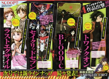 Other series in the new Kadokawa publication will be a manga adaptation of Bones’ Towa no Quon, a Last Exile manga series, a Sacred Seven series, and a manga version of Production I.G’s Blood-C series.