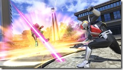 Kamen Rider Den-O is characterized by his skills “Train Slash” and “Special Attack Combo of the Imagin.” He has a special attack that brings out combination attacks from Momotaros, Urataros, Kintaros, and Ryutaros, but it can be cancelled to have it be an attack from Den-O alone. Kamen Rider W