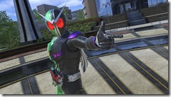 Kamen Rider W is characterized by his “two-in-one” skill “Baton Touch.” The Shotaro Hidari CycloneJoker form is the base but can switch between Philip’s FangJoker form. Switching forms provides a small healing effect. Kamen Rider Ghost