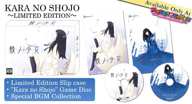 MangaGamer will open the hard copy section of their online store on December 9th, the publisher announced this morning. The first item that will be released via this new store will be the limited edition of Kara no Shoujo. Pictured above, the limited edition of Kara no Shoujo will come with the full game, which will be fully-voiced in Japanese out of the box. You’ll also get a collection of 11 background music tracks from along with it. All of this will be packaged in a special slipcase and will cost $45. Pre-orders for the physical edition are up on MangaGamer’s website now. Pre-orders will begin shipping on December 3rd.