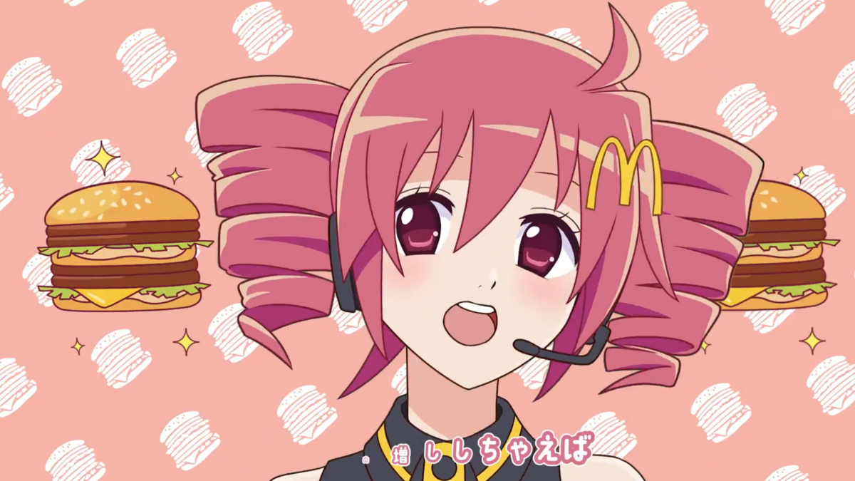 The video is a minute and a half long. In it, Teto has a McDonald’s logo-shaped barrette and an earpiece like she’s working as a drive-through employee. All kinds of burgers bounce around behind her. The lyrics are promoting a deal in which you can get a second patty in your burger for only 120 JPY (80 cents) after 5:00 PM.
