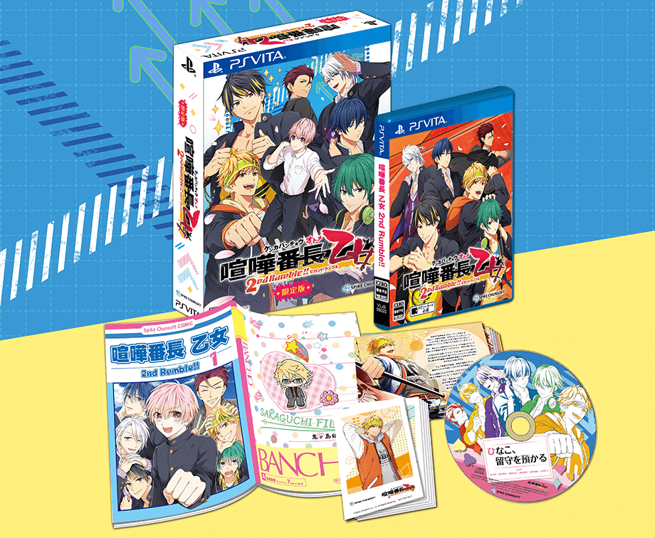 Pre-orders of standard and limited editions come with an original drama CD that takes us through a day in the shoes of the new character Tenma Sagara. Kenka Bancho Otome 2nd Rumble!! releases in Japan on March 14, 2019 for PlayStation Vita.