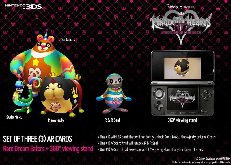 We opened a Japanese copy of Kingdom Hearts 3D [Dream Drop Distance], which included two AR cards. When viewed in-game, one card unlocked a powerful Dream Eater (I got Meowjesty) and the other was a Dream Eater stand.