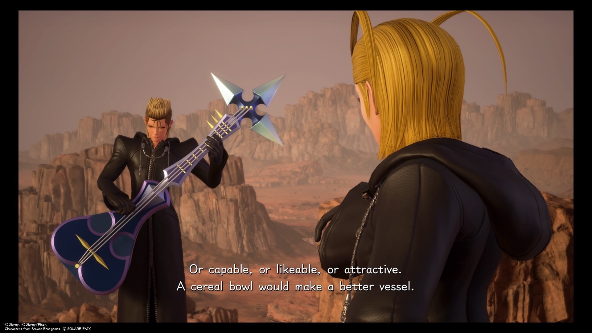 Kingdom Hearts III shows players over and over again the contrast between members and how much of a threat they could serve or help they could be. We see how much they have changed and how their loyalties might lie after being exposed to Xehanort and Sora over the years. Consider some of the characters who, as we go through this installment, are introduced as being a part of Xehanort’s court. Demyx provides some much needed comic relief. He’s the often benched member, with people joking about how valid he is (or isn’t) and him downplaying whatever possible abilities he might have. Seeing him around Larxene, who is as assertive as ever, leads to some enjoyable quips. Watching him paired up with Vexen is just as fun, considering the seriousness of the other member and the frustration he likely encounters by working with someone with a different personality. Seeing the progress Lea makes is even more striking. He has been on this journey since Kingdom Hearts II. He was the one Organization XIII member who seemed to genuinely care about other people and behave as though he had a heart. He was the one to break through and commit himself to the cause, helping Sora and protecting the people who matter. In Kingdom Hearts 3D: Dream Drop Distance, we saw real progress made in his hero’s journey, due to him actually summoning a keyblade. During his training sessions with Kairi, we see him really develop his reasons to fight as memories from games like Kingdom Hearts: Birth by Sleep and 358/2 Days and further his dedication to reunite with the people he has lost. While other people who were connected to the group join Sora’s side and fight for the light, Lea is the only one to actually take up a weapon and join them as a warrior, and his evolution helps us really appreciate how strong a heart can be.