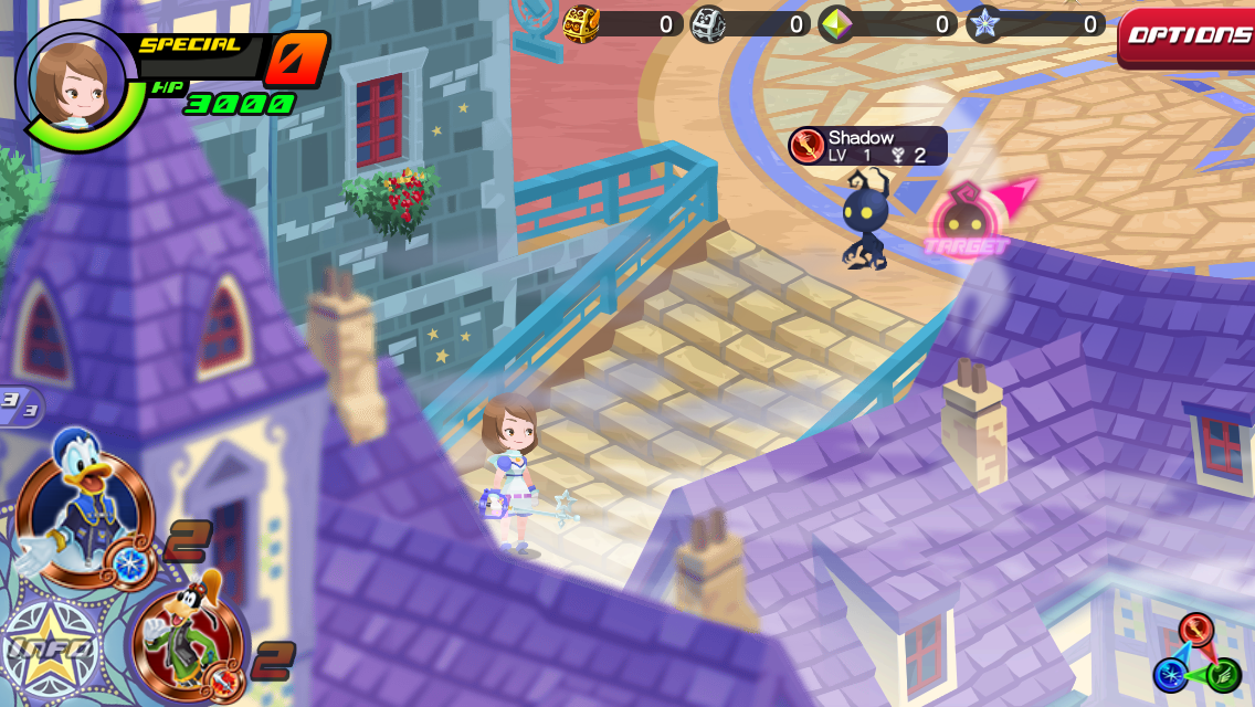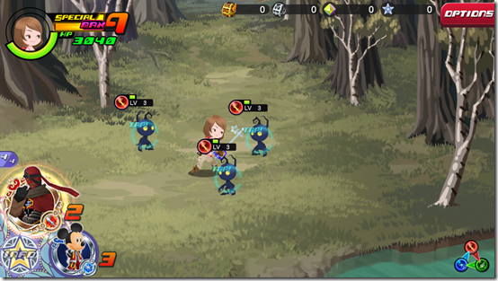 The battle system, however, is very much like Kingdom Heart: Chain of Memories. Only here, Medals are used instead of cards. You get these randomly by giving Square Enix Jewels, which can be earned by completing missions or logging in regularly. The Huey, Dewey, and Louie Support Medals are typically mission rewards and used for leveling up other Medals. Initially, your keyblade can only hold three Medals, and you’re allowed a fourth by “borrowing” one from a friend or stranger before heading into a mission, but you can eventually get to five of your own via keyblade improvements. This means you’re initially allowed four attacks per each turn in battle, but eventually can get up to six attacks per turn.