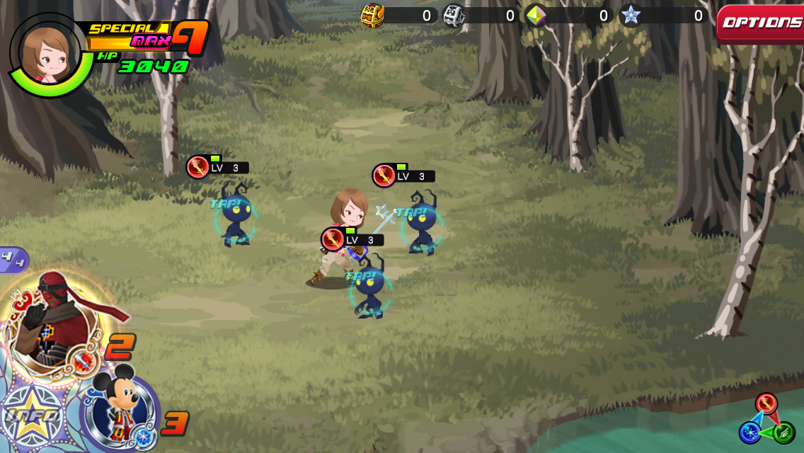 Kingdom Hearts Unchained X’s Medals belong to three different types, which means we get a weapon triangle! Power (red) attacks are strong against speed and weak against magic. Speed (green) bests magic and is susceptible to power. Magic (blue) trumps power and flails against speed. Each enemy has a certain type assigned to it, so it’s wise to check your target before a mission to see if it has a red sword, blue spell, or green wing on it. You’ll want to switch your Medal layout accordingly.