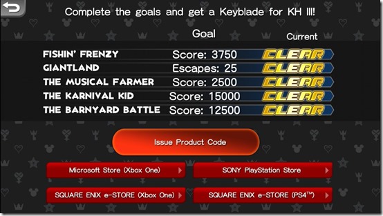 This is done by playing the “Classic Kingdom” mini-games found in the “χ3 [ex tres]” menu. The product code for the Keyblade can be acquired by completing the goals and achieving the scores shown in the above image. After clearing all five goals, head to the “Limited-Time Challenge” page where you’re given the choice of PS4 and Xbox One versions for the early-access code of the Starlight Keyblade. Keep in mind that this simply helps you acquire the Starlight Keyblade from the very beginning of the game, otherwise you can still get it in Kingdom Hearts III without needing to play Kingdom Hearts Union χ.