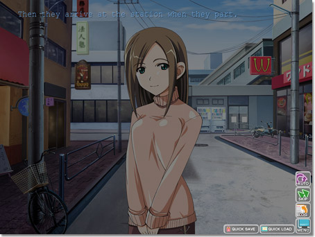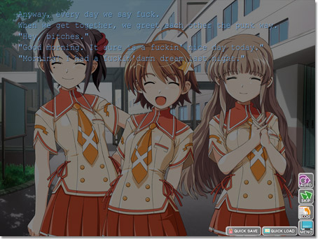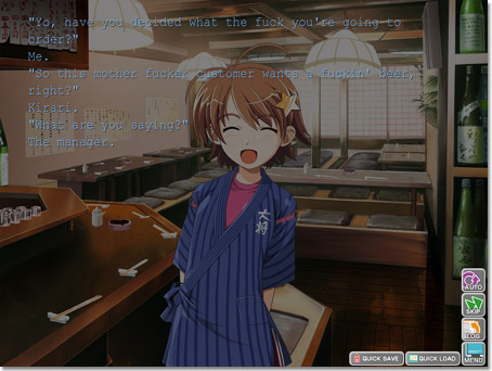 Unfortunately, MangaGamer’s extremely unprofessional localization — at least in the demo build that I’m playing — tends to make you wonder who edited the dialogue…or whether it was edited at all. The English text is riddled with typos, bad grammar and the occasional awkward choice of words.