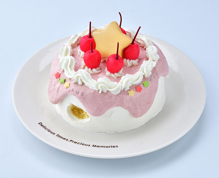 According to the Kirby Cafe official website, the Karby Cake replicates a special dish that appears in Kirby and the Forgotten Land‘s Waddle Dee Café. It’s a strawberry-flavored blancmange (a French gelatin-based dessert) laid over a sponge cake with fruit layers. The stage is made of small pastries and fruits. The cake costs 1,680 Yen (about $14 USD).