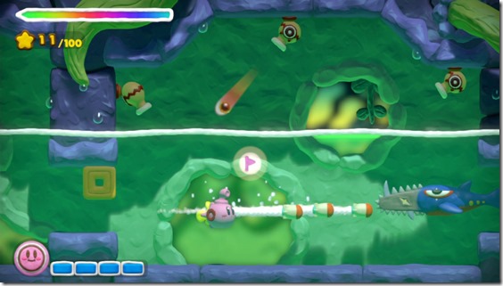 Tapping Kirby will give him a speed boost and help him knock obstacles and enemies alike out of his way. This becomes pivotal in some of the trickier areas, where you can create trick loops to find secrets or gather stars. The E3 demo had three stages available—a beginner stage, a tank stage, and a *shiver* underwater stage. The beginner stage lets you explore an open, grassy area that eases you into the game’s basic mechanics (tap to propel Kirby, create paths for him to traverse). The tank stage turns the adorable pink ball into a war machine, letting fire away at enemies as the stage scrolls ever onwards. I was challenged by the gamers running the kiosk, so I chose to do the demo’s most difficult level: the underwater stage.