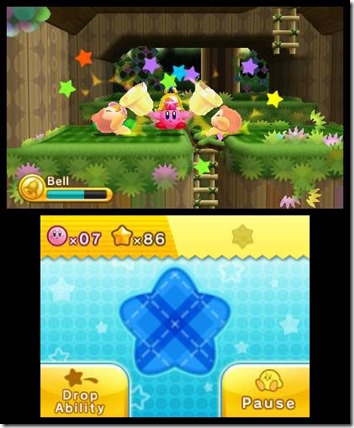 See, Nintendo has a unique development pattern they follow. When the hardware division releases a new system, the software teams go to work finding ways to adapt Nintendo’s properties to maximize the new system’s unique features. When HAL Laboratories tried to fit Kirby to the Nintendo DS touch screen, they twice decided to build entirely new game systems rather than try and shoehorn touch gimmicks into the tried and true formula. This was probably for the best. But faced with the 3DS, HAL has been able to create a Kirby game that takes full advantage of the hardware features without straying from floating and monster swallowing. The specific Nintendo 3DS features that Kirby Triple Deluxe leverages are the 3D top screen, the internal gyroscope, and StreetPassing. HAL has used the 3D very effectively with a wide array of foreground/background stage designs. Sometimes this is as simple as enemies and their projectiles flying forwards and backwards between the two, but often things get more involved. Platforms might be visible only in a mirror on the background, tanks chase Kirby while firing projectiles into the foreground, and weights and counterweights need to be balanced between both. In every level there’s something of this nature in play and it adds an extra layer of depth to the game. The internal gyroscope isn’t used as often, but it’s used more effectively than most 3DS games to date. The game smoothly fades the 3D effect out any time Kirby enters a room with a tilt function tool, which resolves potential screen issues before they even arise. The tilt puzzles on display aren’t mind-blowing but they work well within the levels, the technology works flawlessly, and tilt sequences never overstay their welcome.