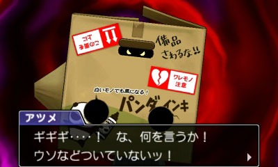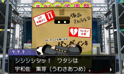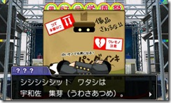 Some of the clues that will be helping Phoenix and the gang solve the case are a newspaper article that mentions a love-triangle between Juniper and two other male students, and a suspicious man who hides his identity using a cardboard box. The mysterious man who goes by the name of Uwasa Atsume (which means Rumor Collector in Japanese) may know something about the case. It is said that he also has various items hidden in his box that may be crucial in solving the case.