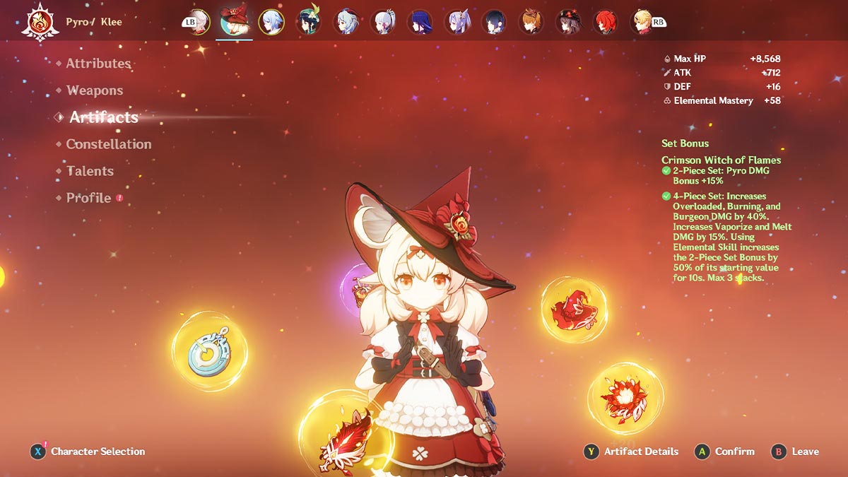 Klee is a 5-star Catalyst user in Genshin Impact that applies constant Pyro damage to enemies on-field with her Jumpy Dumpty skill. Because of this, the adorably dangerous character benefits from a build that buffs her explosive elemental attacks. Klee’s best Artifact set in Genshin Impact is the Crimson Witch of Flames. The set can be obtained in the Hidden Palace of Zhou Formula Domain, which is located in Bishui Plain, Liyue. The powerful set not only gives a 15% Pyro DMG Bonus, but it increases Overloaded, Burning, and Burgeon reaction DMG by a staggering 40%. If you are more into Vaporize and Melt teams, the set also gives you a 15% increase in damage. Klee has many additional sets she can take advantage of. Below is the list of the best Artifacts for Klee in Genshin Impact: