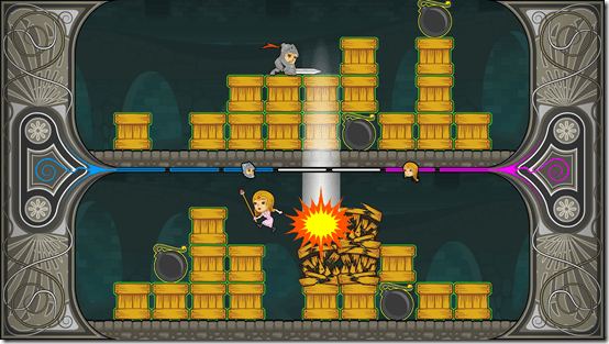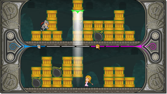 Knight & Damsel from MK Ultra, an indie studio with members from the Sound Shapes team, is a cute play on the damsel in distress trope. One player controls a knight on the top of the screen and player two is the damsel on the bottom. The knight runs from left to right while the princess runs from *right to left.* Eventually, both characters meet in the middle with a humorous "shocked to see you" expressions.