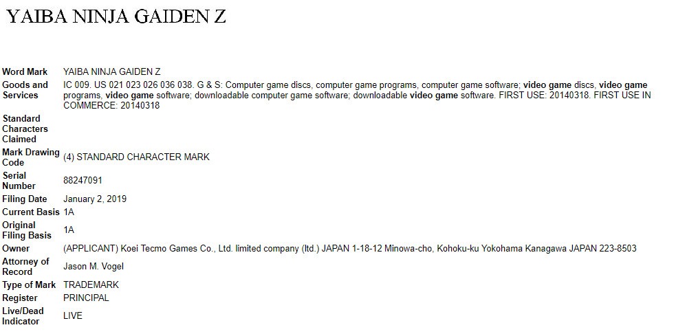 Koei Tecmo recently filed a new trademark in the United States for a Yaiba: Ninja Gaiden Z, suggesting a possible new release to be announced in the near future. Yaiba: Ninja Gaiden Z is a third-person hack and slash spin-off of the Ninja Gaiden series that was originally developed by Spark Unlimited and produced by Comcept’s Keiji Inafune in March 2014 for PS3, Xbox 360, and PC.