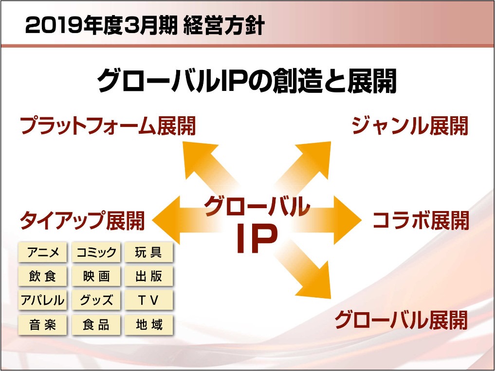 The above chart gives us a look at the titles developed internally at Koei Tecmo and a comparison of shipments with shipments in Japan in blue and overseas in red. From left to right the titles are: Hokuto ga Gotoku, Hyrule Warriors, Attack on Titan, Nioh, Fire Emblem Warriors, Dynasty Warriors 9, and Attack on Titan 2. As you can see, the total shipments are leaning much more towards the overseas market, so you could see why Koei Tecmo is looking to further expand and develop their IP for the global market. At the bottom of the chart it says Koei Tecmo has “Plans for a collaboration with a prominent overseas IP.” This was actually shown in a financial results report from the company a couple years ago when Koei Tecmo said that they made a collaboration deal with a major Western IP; however, we haven’t heard much about it since then so this is more of an update on the future collaboration if anything. Koei Tecmo has been focusing on global expansion for the past few years, and while there are many similarities going forward in the latest financial results, we’re seeing more and more focus on the global approach from the company.