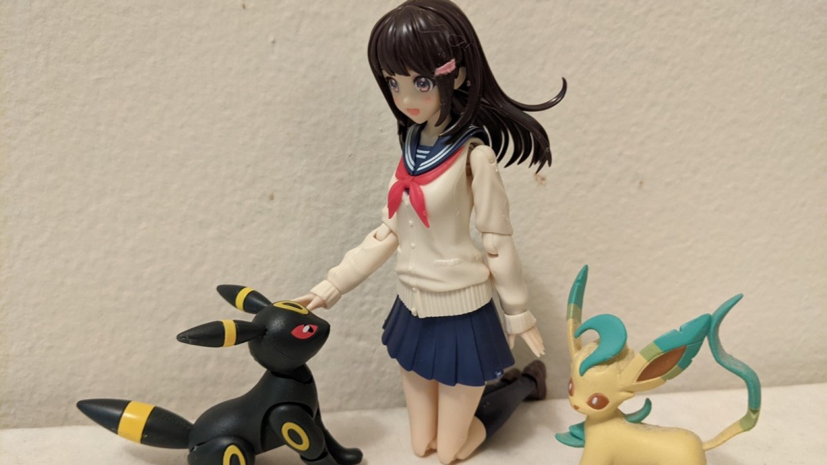I’m going to be frank. There are two other reasons why I’m a big fan beyond this being a fun and quick build. One is that En Morikura is behind the character designs for each Sousai Shojo Teien character. (Morikura did designs for characters like Kizuna Ai too.) The box for this standard version of the model kit even has a gorgeous picture of Madoka Yuki on it. But the other is… I love the opportunities for possible fun scenes. For example, she’s about the right size to pose with figmas, just a tad taller. So I could pose her with the Astolfo/Rider figma and pretend she’s a Fate/ series Master. She’s also the right size to pair up with certain Bandai’s Pokemon model kits to become a Pokemon Trainer Lass. Maybe I’ll eventually use the Megami Device Bullet Knights Lancer model’s head with it and pretend she’s a robot trying to pretend to be a normal high school girl? She works in a number of situations.