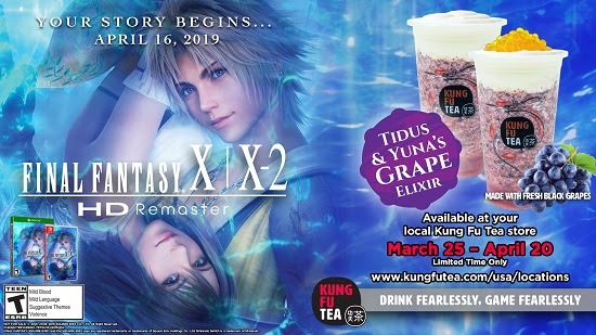 Another Final Fantasy-related food promotion is taking place. Square Enix has announced Kung Fu Tea will offer a Final Fantasy X|X-2 HD Remaster-themed drink ahead of the Nintendo Switch and Xbox One launches of the collection. People will be able to get Tidus & Yuna’s Grape Elixir at participating stores. People who stop in can buy the drink and get sticker with Tetsuya Nomura artwork with it. Kung Fu Tea’s Tidus & Yuna’s Grape Elixir will be available in stores between March 25 and April 20, 2019. For those who have never seen one, it specializes in varieties of bubble tea. The Grape Elixir is basically its Grape Cream drink with a different name, with people getting a milk cap on top of the black grape and berry jam mix and the option to have toppers like grape popping bubbles or boba on top of that. There will also be a contest starting when the promotion begins. There will also be giveaways held on Kung Fu Tea’s Facebook, Instagram, and Twitter pages to win one of 25 Nintendo Switch or 25 Xbox One Final Fantasy X|X-2 HD Remaster download codes. Another giveaway will involve two custom-designed Nintendo Switches and two custom-designed Xbox Ones. This isn’t the only Final Fantasy-adjacent promotion. Chocobo’s Mystery Dungeon: Every Buddy! has a Dippin’ Dots campaign running right now. This involves four flavors being renamed to match different job classes found in the game and a contest to win copies of the game and systems. Final Fantasy X|X-2 HD Remaster will come to the Nintendo Switch and Xbox One on April 16, 2019.