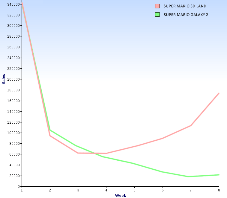 * During week 7, Galaxy 2 wasn’t in the top-20 software sales chart. Since Media-Create don’t provide numbers for games outside the top-20, I’m not sure exactly how much it sold that week. Just that it was below 18,614 copies.   Or to put it in graph form:   Mission accomplished for now, I would say. Once the next 3D Mario game is revealed, and we learn more about it, we’ll probably have a better idea of if and how Super Mario 3D Land has affected the future of 3D Mario titles.   Food for thought: Something that keeps nagging at me is that Super Mario Galaxy 2 was released in summer, while Super Mario 3D Land was released close to the holiday season. Would Galaxy 2 perhaps have done much better had it had the benefit of the holiday season?