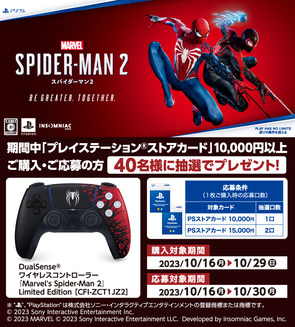 Lawson launched a brand new Marvel’s Spider-Man 2 lottery campaign where fans can get the chance to win the limited edition Spider-Man 2 Dualsense controller. The campaign will run until October 30, 2023. [Thanks, Game Watch!] By purchasing a ¥10,000 (~$67 USD) or ¥15,000 (~$100 USD) PlayStation Store card from any Lawson convenience store, Natural Lawson, or Lawson Store 100 locations across Japan, entering the last 19 digits underneath the barcode on the card onto the submission website, and completing a survey, fans will be entered into the lottery campaign. There is no entry limit, so fans can purchase as many PlayStation Store cards and enter the lottery as many times as they want. 40 lucky fans will be chosen from the lottery to win the Marvel’s Spider-Man 2 Dualsense controller. Details about Lawson’s ongoing lottery campaign can be viewed below: