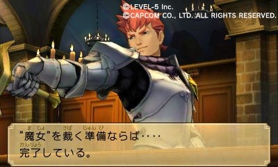 A few of the game’s character were introduced during the showing, too. The girl seen running away from the witch hunt is Mahoune. The leader of the hunt, the investigator, is a Sir Jiiken Barthlord, seen donning a full suit of armor and brandishing a sword in one of the screenshots. He is intended to be a medieval-styled rival for both the protagonists. On the side, Hino noted that the naming sense with its many puns really made the game feel like an entry in the Ace Attorney series (“Mahou” means magic, and “Jiken” means a case; as in a murder case). The visuals for the game are surprisingly suitable. Phoenix apparently made the transition to 3D fairly easily (Layton, on the other hand, had already made his great dimensional leap in Professor Layton and the Mask of Miracles, the fifth game in the series on the 3DS). Takumi himself acknowledged that he had had doubts about the transformation, but upon seeing it, felt that it suited the defense lawyer perfectly.