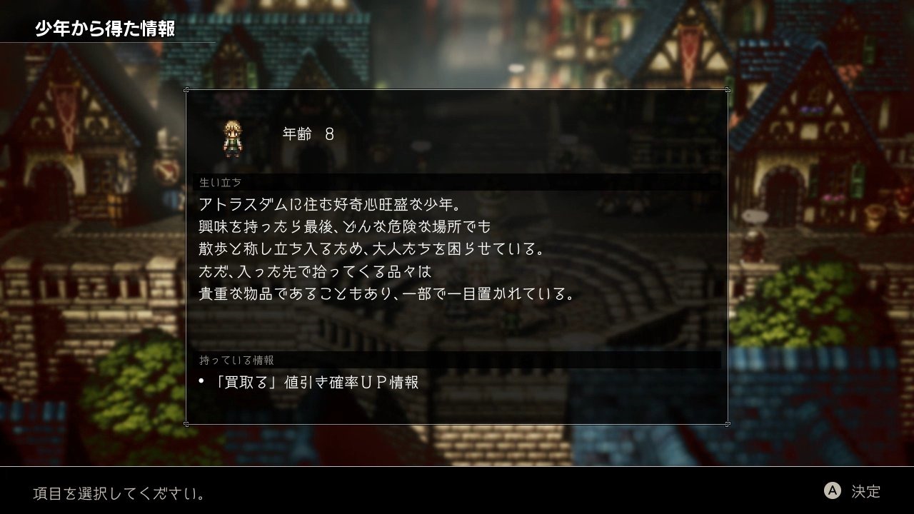 His unique Path Action is “Scrutinize” that allows him to extract useful information from the people he encounters, gain insight into someone, pick up information that can help you in your travels, or even uncover secrets and evidence to solve mysteries.