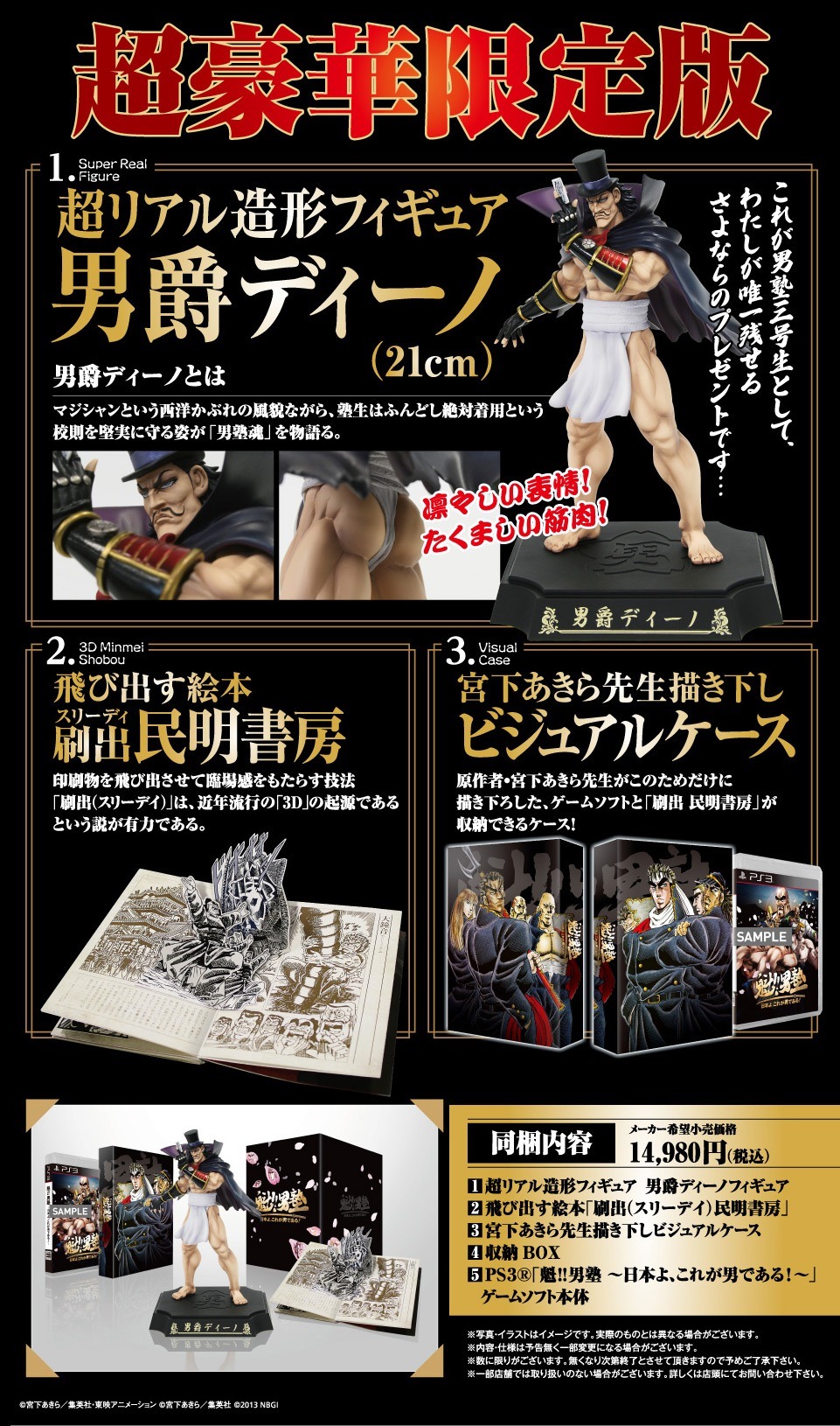 There are apparently some 200 different types of such hazards in the game. It can’t get any better than that.Players can utilize these environmental hazards to finish off foes, with each smash into a spiked wall or spinning sawblades accompanied by a manly announcers shouting. Players also have to take care not to accidentally dash themselves into the hazards either—the video shows a fighter accidentally slipping into the electric chair. Each character’s remaining life is also shown off as a candle burning itself down. Burn bright young ones!   The regular edition of the game costs 7480 yen (About $75) while the limited edition will run double that at 14,980 (About $150). The limited edition comes with a smorgasbord of extras though, such as a 21 cm Baron Dino figure—resplendent in his top hat, cape, handlebar mustache and fundoshi underwear. The limited version also comes with a visual case of manly glaring men to keep the game in and a 3D pop-out art book all of which is stuffed into a much larger, manly black box with sakura petals.