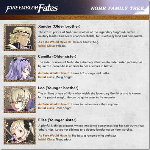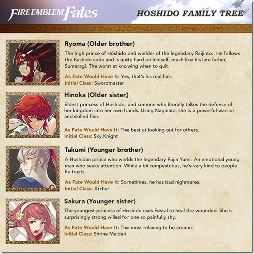 Nintendo of America recently shared a couple of new images for Fire Emblem Fates, featuring the members of Hoshido and Nohr, the opposing families in the game. You can check out the images below to learn more about the two families.