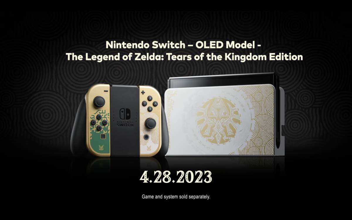 The Nintendo The Legend of Zelda: Tears of the Kingdom gameplay presentation ended with the reveal of a new OLED Switch model. As expected, it features iconography and color schemes based on the game. It will launch on April 28, 2023, a few week’s before the game’s May 12, 2023 debut. A purchase will also only include the new themed Switch and not a copy of the game. There will also be a Pro Controller and themed case available on May 12, 2023. Nintendo noted that the system will cost $359.99, but didn’t note when the pre-orders for the system will begin. However, it did show off the system, its Joy-Cons, and the dock. The dock features the Triforce in gold against a white background. The two Joy-Cons are each gold, though with different designs seen throughout Tears of the Kingdom on them.