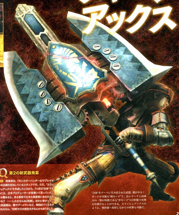 Earlier today, we reported details on Monster Hunter 4’s second new weapon—the Charge Axe. The Charge Axe lets you switch between Sword and Axe modes. Take a look at the weapon below: