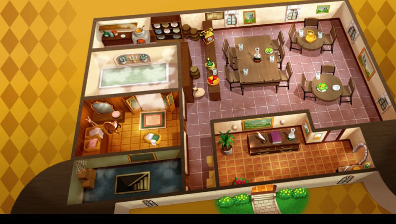 Here’s the Dragon Princess Manor. The first floor has a bathhouse and staircases to the basement. You and your party stay on the second floor. The third floor houses the weapon shop, manager’s room, Roona’s room, and item shop.