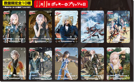 Square Enix, Pocky maker Ezaki Glico, and Family Mart are working together on a Lightning Returns: Final Fantasy XIII campaign. If you purchase two participating Glico products at Family Mart you can get one of these Final Fantasy XIII cards.