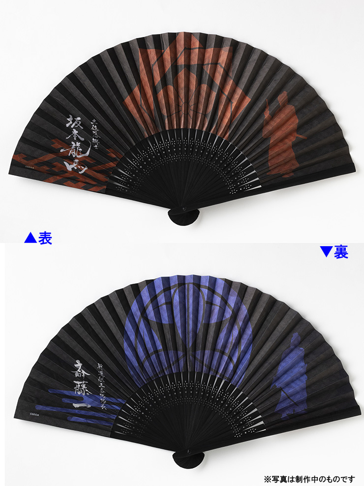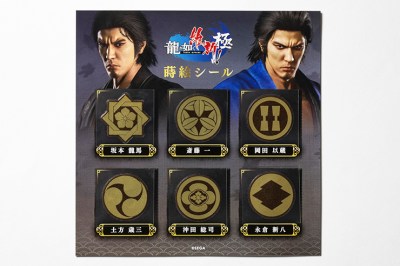 Like A Dragon: Ishin Super DX pack also includes a bamboo folding fan with two designs. One side bears the crest of Ryouma Sakamoto, and the other side bears Saito Hajime’s crest. Another item is a sitting cushion. The top has a stylized rendering of the game’s logo illustration, while the bottom shows a collection of all the characters’ crests. Finally, a six-sticker set of the principal characters’ family crests is included, alongside an extra large bromide card of the poster illustration.
