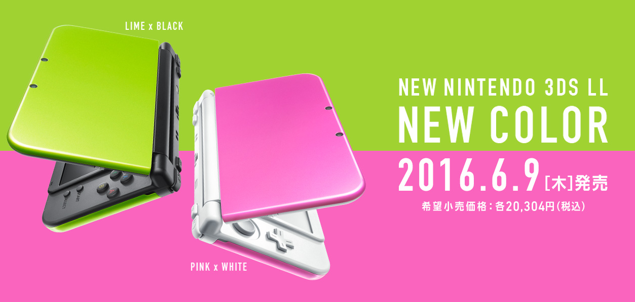 Nintendo announced today that Japan is getting two new colors for the New Nintendo 3DS XL system with the Lime x Black and Pink x White on June 9, 2016. Lime x Black