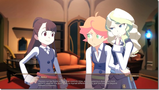 Little Witch Academia: Chamber of Time is such a character heavy game. The focus is completely on Akko and her classmates. We get to see them at their best and even worst as they explore Luna Nova. The fact that they are reliving the same day over and over helps us learn more about the setting. Its visual novel elements give us opportunities to constantly interact with characters. And, even if this is all new to us, it offers brief introductions to show summaries of what happened in the anime series. Everything comes together to make sure no one feels excluded.