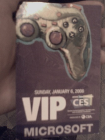 OK, I'm at CES and about to going to experiment liveblogging the keynote address. It hasn't begun yet, everyone is still waiting in line to get seats. A few fortunate people hold VIP passes that put them in a much better spot in line. Hmmm… notice anything unusual about the pass? The controller may be Xbox green, but it's a PlayStation conroller! Look at the face buttons and the position of rhe analog sticks. Strange, huh? It's standard CES artwork so it isn't a conspiracy. I suposse when the artist thought this was the defacto standard for a controller.