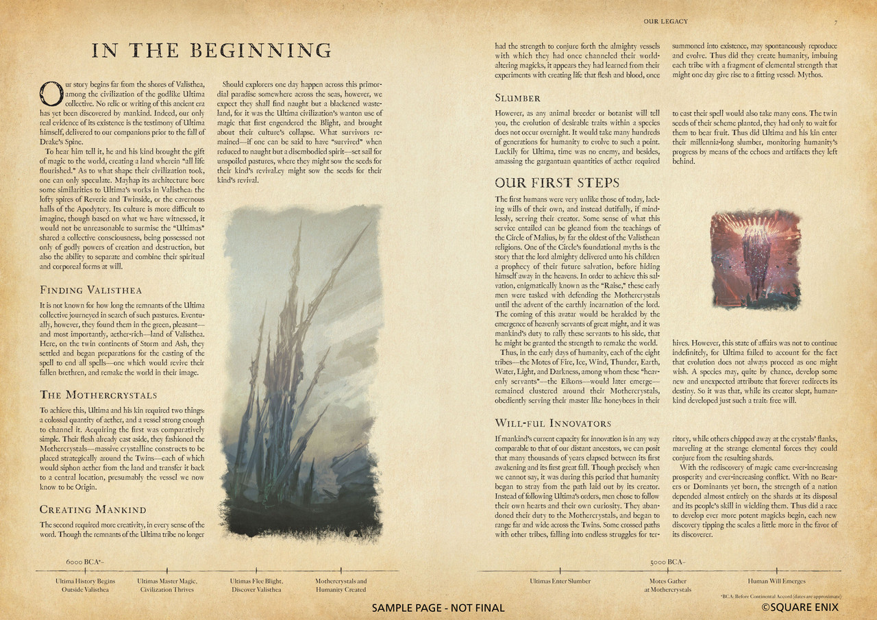 This makes a huge difference, as it doesn’t feel like seeing a physical representation of The Thousand Tomes or going through a standard type of art book or Ultimania. It’s written like a historical archive or even textbook. For example, the “In the Beginning” portion reads like something of a factual text while also almost coming across as a creation myth, due to it detailing the arrival of Ultima and the establishment of the Mothercrystals. When we get to “The Dominents” section, it doesn’t come across as straightforward character profiles. It’s written like brief biographies of each of the major individuals. The “Our Home” area reminded me a little of some of the travel guides for places like Japan or Mexico that I received as gifts in high school and college when I expressed interest in visiting those countries. It feels more like you can sit down and read through a whole section and treat them as different kinds of informative texts, instead of only looking up one or two points for clarification.
