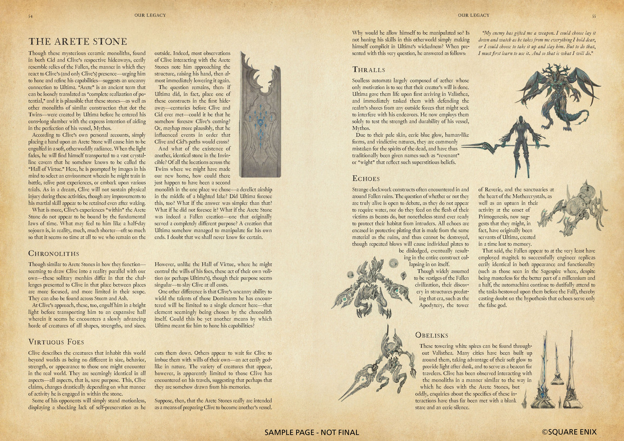The main reason for this is due to the execution. When Square Enix had the team set out to work on LOGOS: The World of Final Fantasy XVI, they didn’t design it in the same way as the Ultimania series of books, but instead worked with the same sort of elements incorporated in FFXVI proper. One of the features of the game is The Thousand Tomes. This is maintained by Harpocrates II Hyperboreos in the RPG. As we experience parts of the story, we can send Clive to check in with the scholar to update what is essentially an in-game glossary and see Active Time Lore elements going over people, places, and event. This actual physical book feels like a hardbound copy of that kind of data and information. It’s set up so it feels like Harpocrates wrote it.