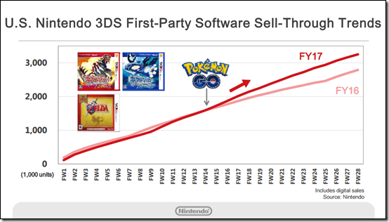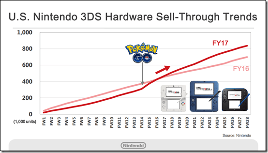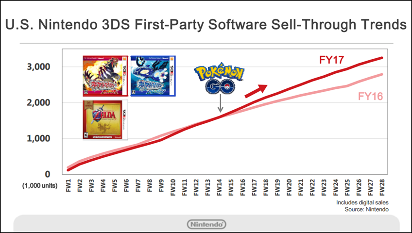 Next, this graph shows Nintendo 3DS hardware sellthrough trends in the U.S. compared with sell-through for the previous period. In the U.S., the previously released Nintendo 2DS was dropped to an even more affordable price, and promotional activities aimed at children and parents were effective in increasing sales. The release of Pokémon GO on July 6th also led to a major increase in sales of the Nintendo 3DS family systems, where consumers can enjoy past titles in the Pokémon series. The trend here is higher than that for the previous period, and we are maintaining this momentum as we head into the holiday season. Note: Pokémon GO is an application for smart devices (Development and Publishing: Niantic, Inc., Development Oversight: The Pokémon Company)