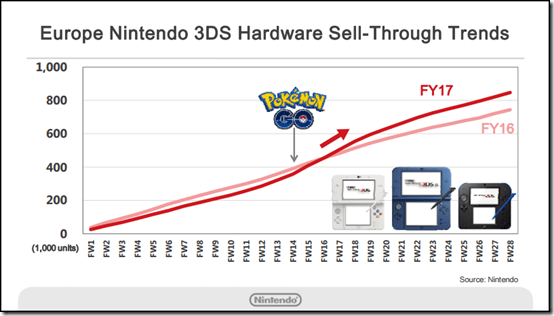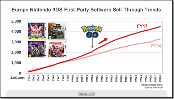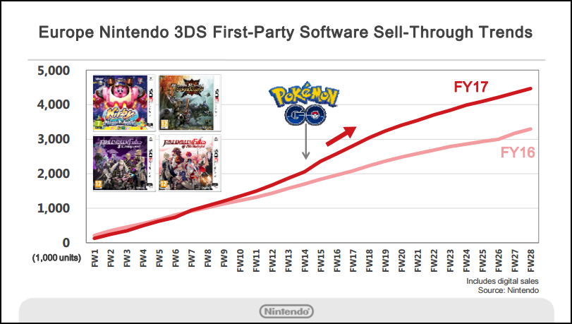 This graph shows Nintendo 3DS hardware sell-through trends in Europe compared with sell-through for the previous period. As in the U.S., the release of Pokémon GO across Europe starting in July spurred momentum for hardware sales.