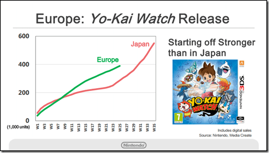 In Europe, the first title in this series, Yo-Kai Watch, was released this year on April 29, with Nintendo of Europe managing distribution. This graph compares the sell-through in the European market with the earlier release in the Japanese market. It is easy to see that Europe is off to a strong start, outpacing the sales figures of the Japanese release. I am told that the Yo-kai Watch toys are selling well in Spain and France as well, so we anticipate further demand as we head into the holiday season.
