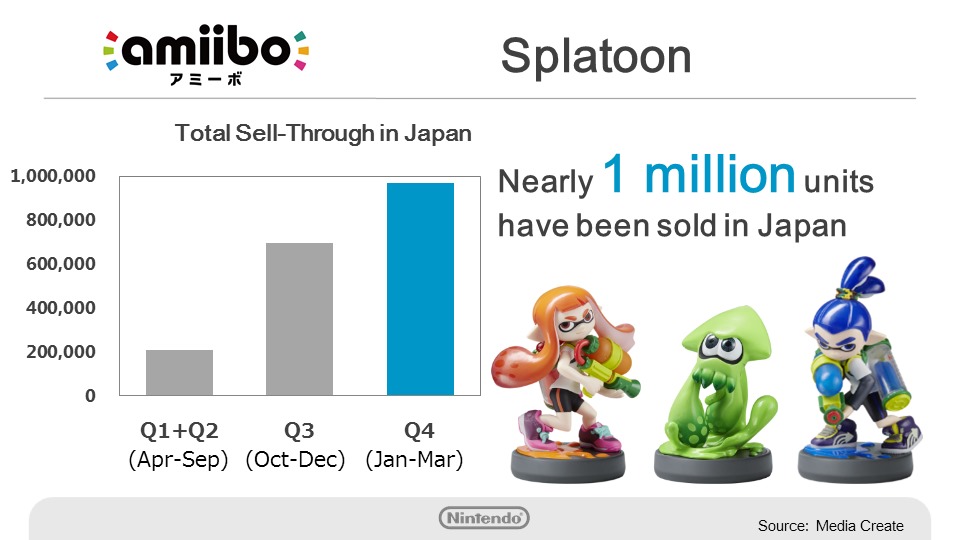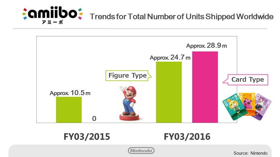 Next, we will cover the amiibo business. Over the fiscal year ended March 2016, we shipped about 24.7 million amiibo figures and about 28.9 million amiibo cards, a huge increase over the prior fiscal year. By providing a continued presence for Nintendo characters in stores, we believe the amiibo platform has created great benefits for all of Nintendo’s platforms.