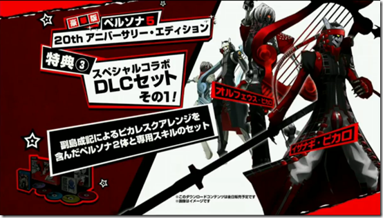 The third is a DLC set, featuring special Izanagi and Orpheus Personas as part of a special collaboration. They will also have exclusive skills.
