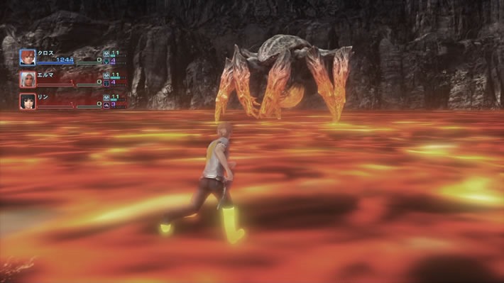 The character in the above image is walking around in lava, so you might need some kind of special equipment of effect to be able to do so. Judging by the looks of their health, perhaps Elma and Lyn forgot to bring their own anti-lava boots.