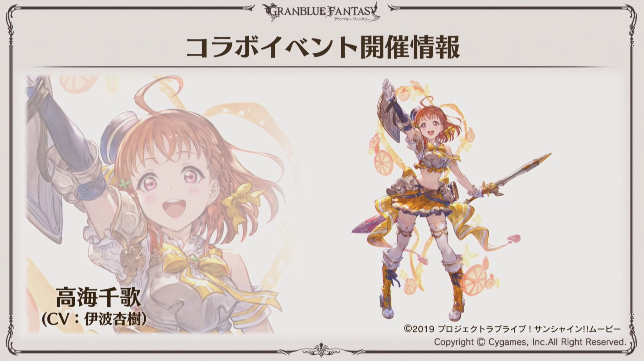 In addition to the big Tales of Asteria collaboration, Granblue Fantasy has another big crossover with Love Live! Sunshine!! featuring the nine members of the idol group Aqours. You can check out the announcement trailer along with a video message from Aqours at the 3:38:48 mark of the video. All nine members of Aqours will appear as part of the collaboration sometime in August, but we got a sneak peek with an illustration of Chika Takami. Granblue Fantasy is available on iOS and Android.