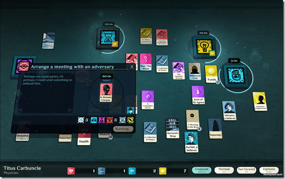 Authorities can make these decisions additionally complicated, as they will look to stop the player should they draw enough attention. Despite whatever depraved inclinations the player may pick up based on their choices, they will still gain a cause to follow over the course of the game, and must make decisions that will thwart authorities while still furthering their task and allowing them to engage in their sinister habits, all based on limited card choices and strict time limits.