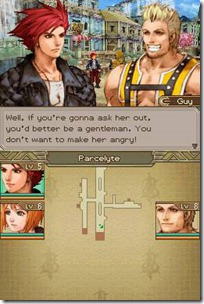 Battles are in realtime. Maxim and his friends can do four separate actions, each assigned to one of the DS buttons — regular attack, special attack (explained above), roll, and jump. You can also use the R button to charge before using a regular or special attack for different effects and more damage (Oddly enough, the regular attack button is Y, causing no small amount of confusion for me.) The battles are fun, although I distinctly found myself preferring to use some characters over others. Guy was too slow for me, and Dekar just didn’t stand out.