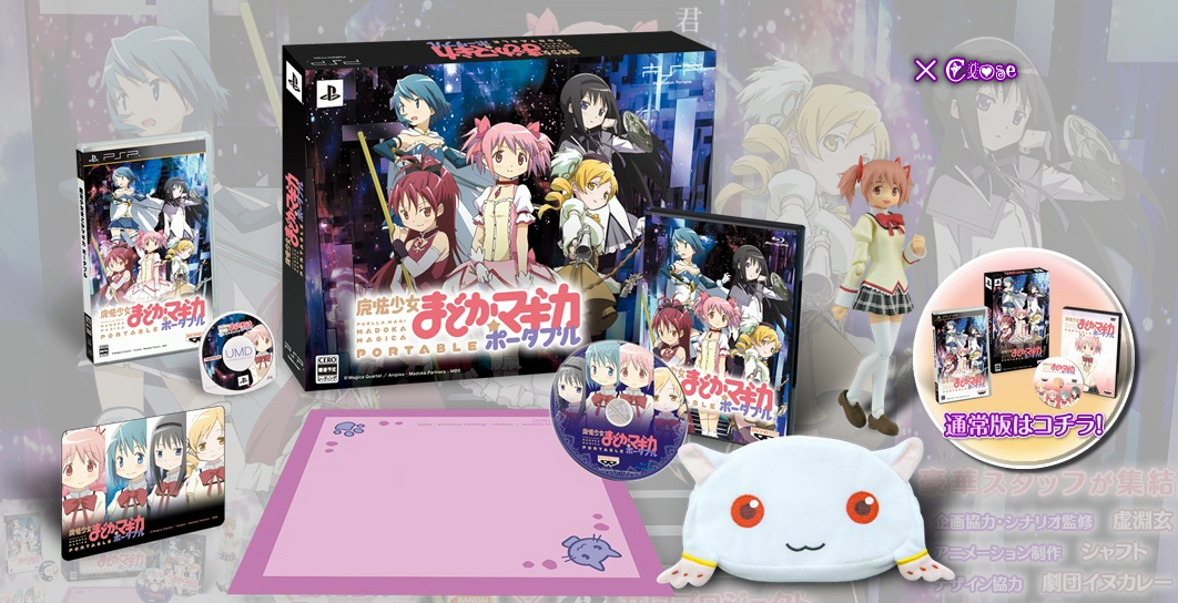 Puella Magi Madoka Magica Portable is slated for release on March 15, 2012. Famitsu has a handful of screenshots and a look at the limited edition. That package includes a Madoka in a uniform set, special video on a Blu-ray disc, a handkerchief, soft pouch, clear card case, and PSP game packed in a box designed by Shaft. The limited edition costs 11,990 yen ($157) while a stand alone game is 6,480 yen ($85).